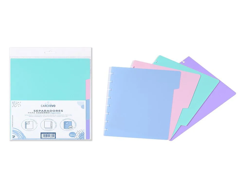 Bolsa con 4 separadores en tamaño A4 (folio) o A5 (cuartilla). Fabricados en polipropileno extra-fuerte. Extraíbles. Colores pastel. Para cuadernos Ingeniox de Carchivo.