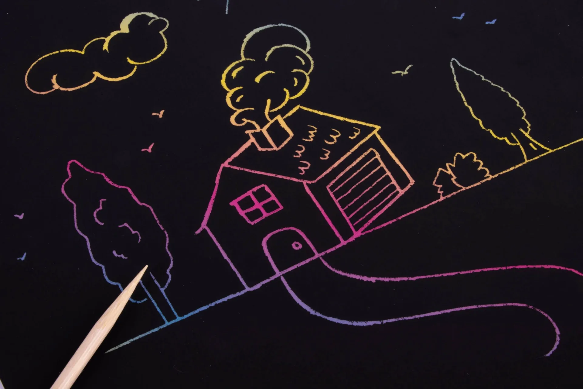 Láminas de superficie negra y fondo multicolor. Contiene unos palitos de madera, con los que ir rascando y dibujando en la lámina.